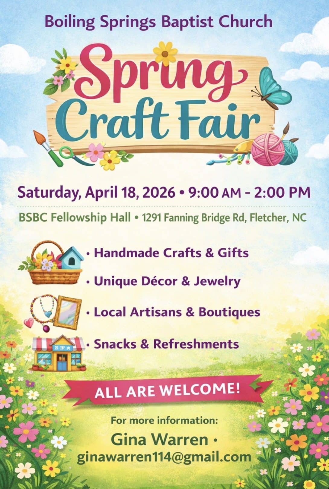 Boiling Springs Baptist Church will host a Spring Craft Fair on Saturday, April 18, 2026, from 9:00 AM–2:00 PM in the Fellowship Hall. Come shop a variety of local vendors and handmade goods while enjoying a fun day of community and fellowship.